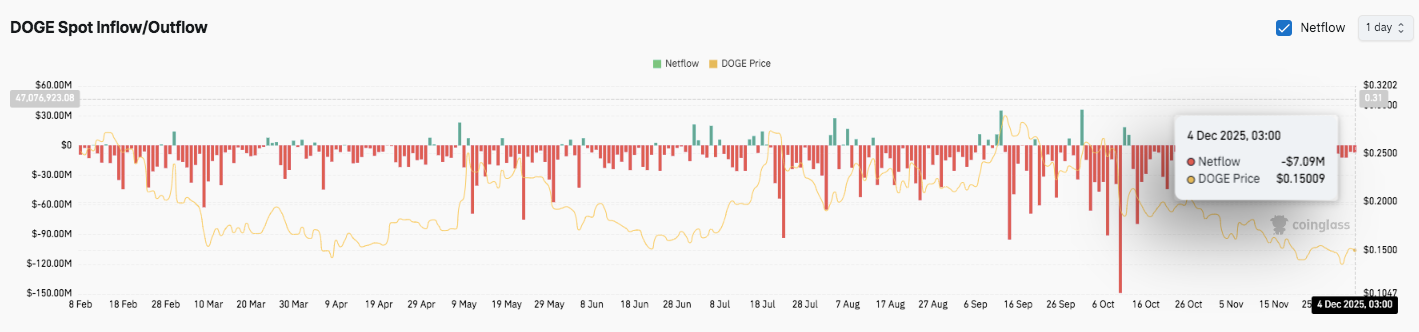 Spot flows show persistent outflows, with many sessions displaying strong distribution. Several large outflow spikes near the $60 million to $120 million range reveal sustained selling pressure. Moreover, December activity remained negative, with about –$7.09 million recorded as Dogecoin traded near $0.1509.