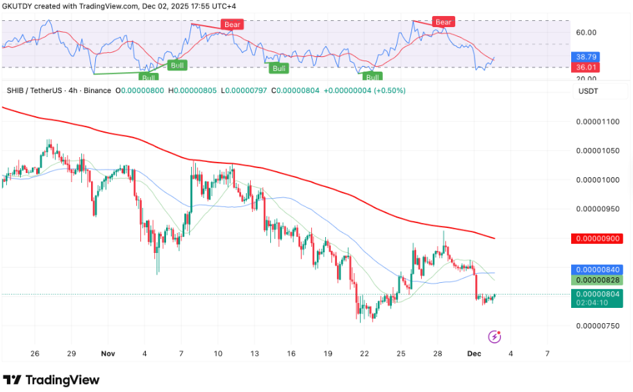Shiba Inu flashed a bearish signal on the second day of December, recent price analysis confirmed. Specifically, a bearish cross occurred on the 4-hour timeframe, as the 50-period simple moving average (SMA) moved above the 23-period SMA, signaling another bearish bias for the meme coin.