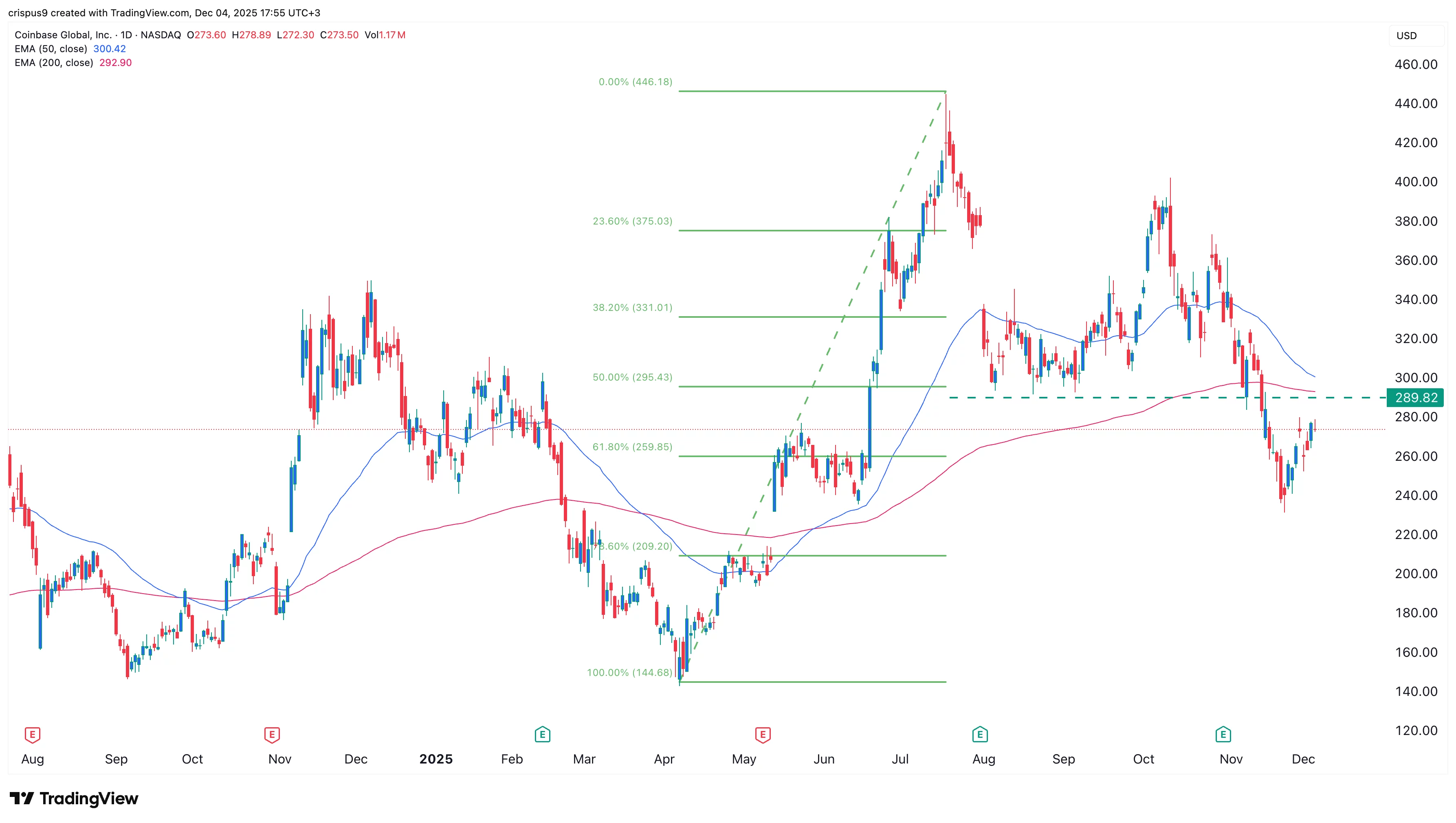 • Technical analysis suggests that the COIN stock price will reverse and hit the support at $200.