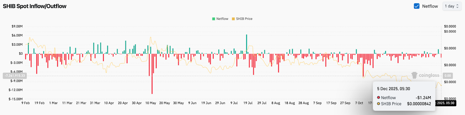 Spot flow data shows continued selling pressure. On December 5, SHIB recorded a net outflow of roughly $1.24 million, while price sat near $0.00000842. This is part of a much larger trend, with red prints dominating over the past several months as liquidity steadily leaves the ecosystem.