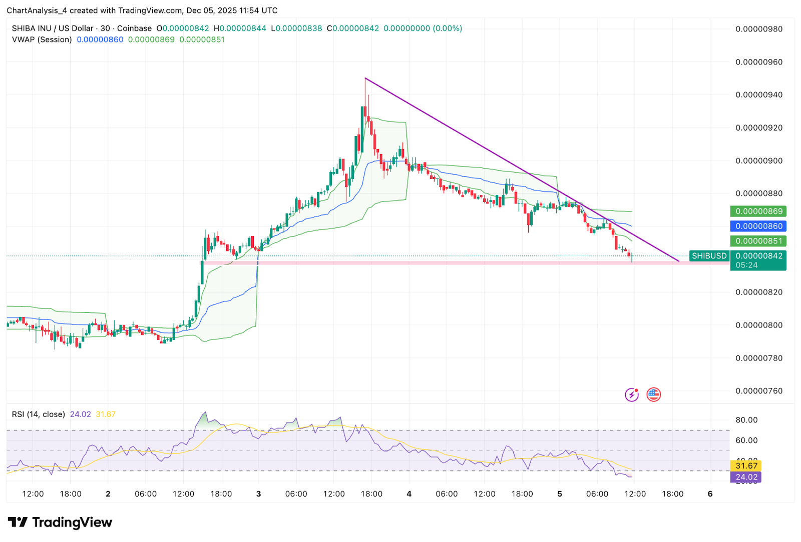 Shorter timeframes show SHIB rejecting the descending trendline for the second time this week. Price lost the VWAP and slid beneath intraday support, putting buyers on the defensive. The RSI is deeply oversold, but there is still no evidence of aggressive accumulation from dip buyers.