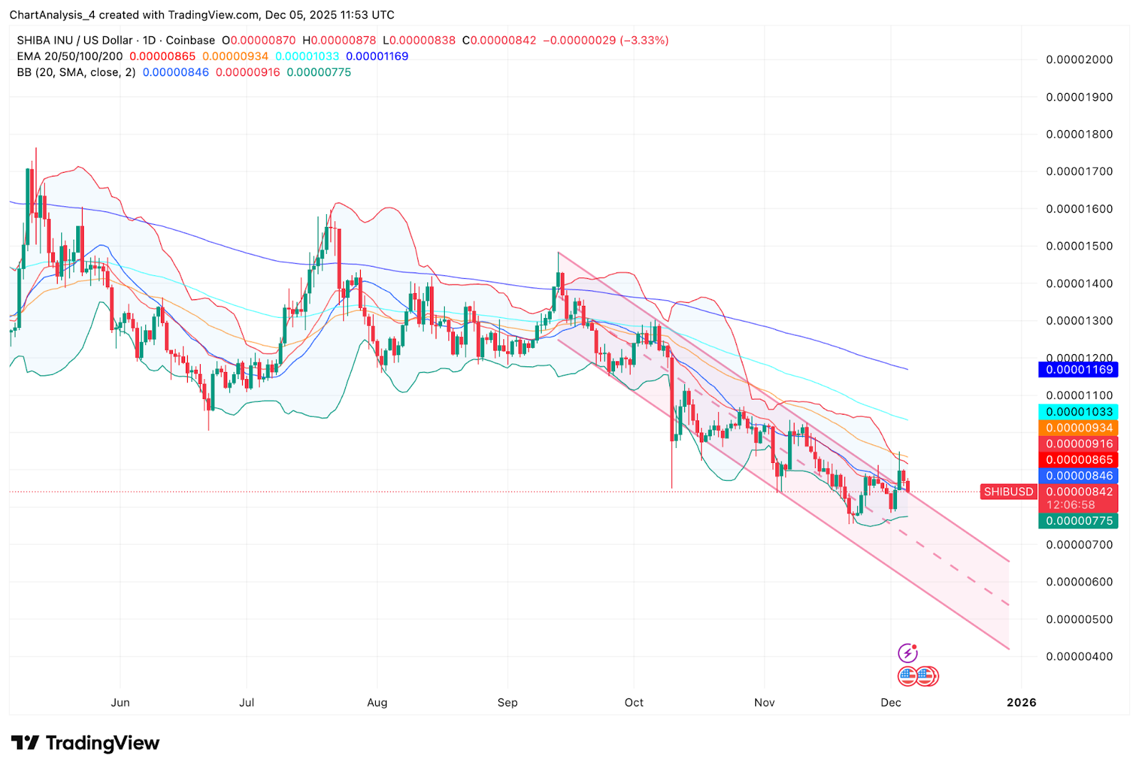 The upper Bollinger Band and 20 day EMA capped the most recent rally, forcing a rejection that dropped price back into the middle of the channel. Unless SHIB can close above $0.00000916, momentum remains biased toward lower levels.