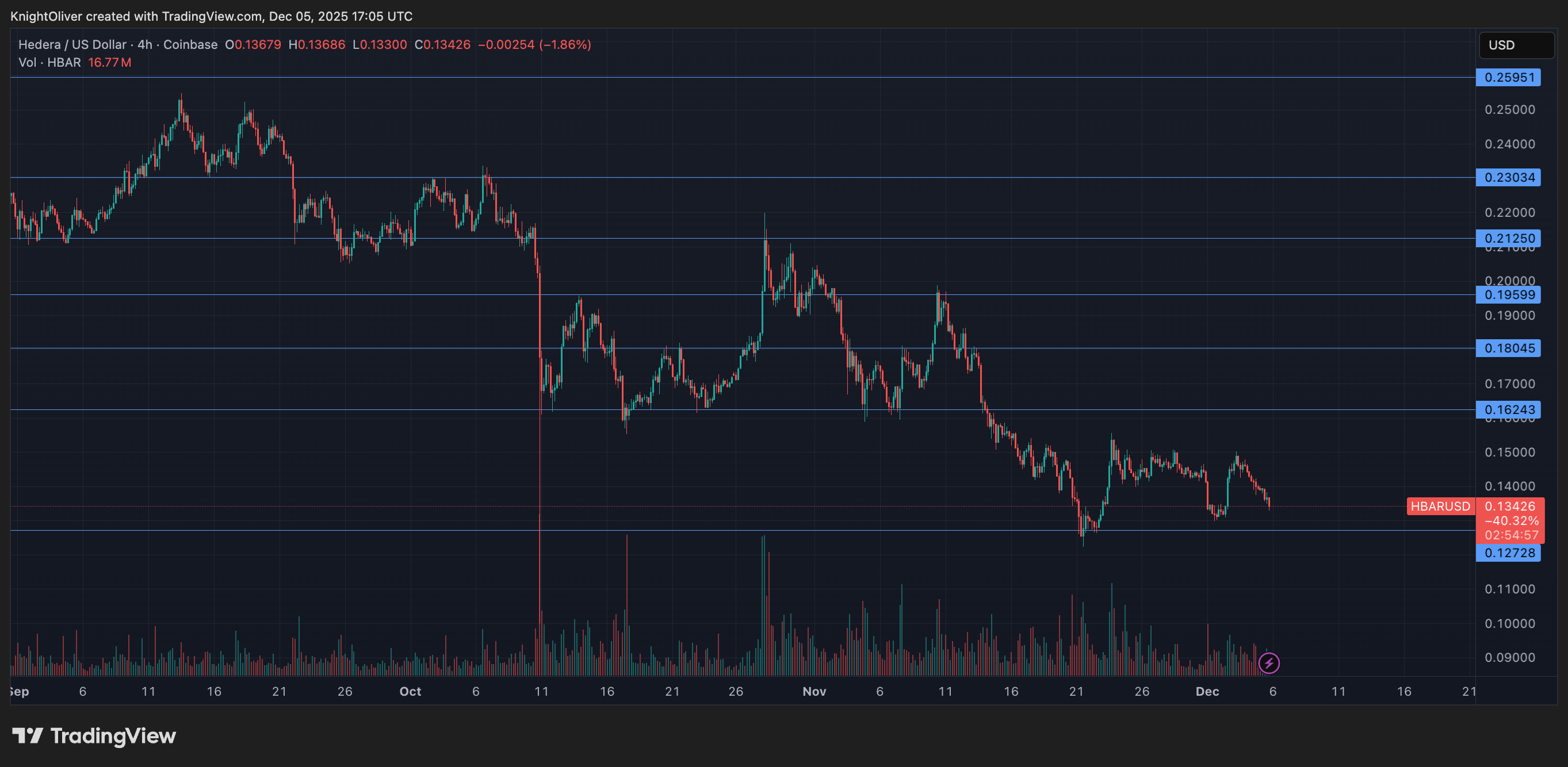 HBAR retreated 2.2% during Thursday's session as technical selling overwhelmed emerging ETF speculation. The token broke decisively below $0.1380 support on volume that peaked 47% above the daily average of 35.5 million tokens.
