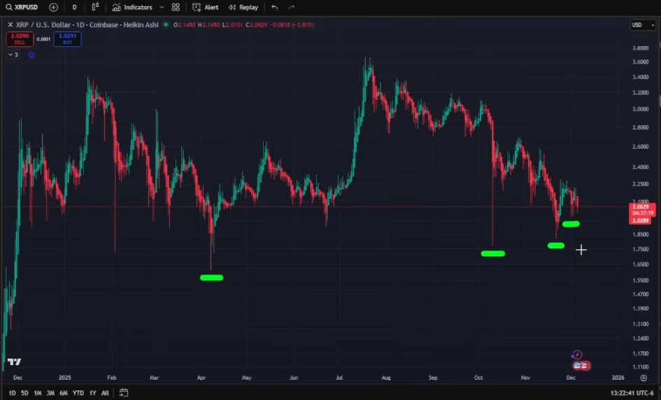 Notably, XRP has continued to face downward pressure since hitting a peak of $2.21 on Dec. 4 after its 8% rebound push. XRP has dropped 7.37% since then, barely holding on at $2.03, but ExtraVod believes the market has not yet seen the worst of the downtrend.