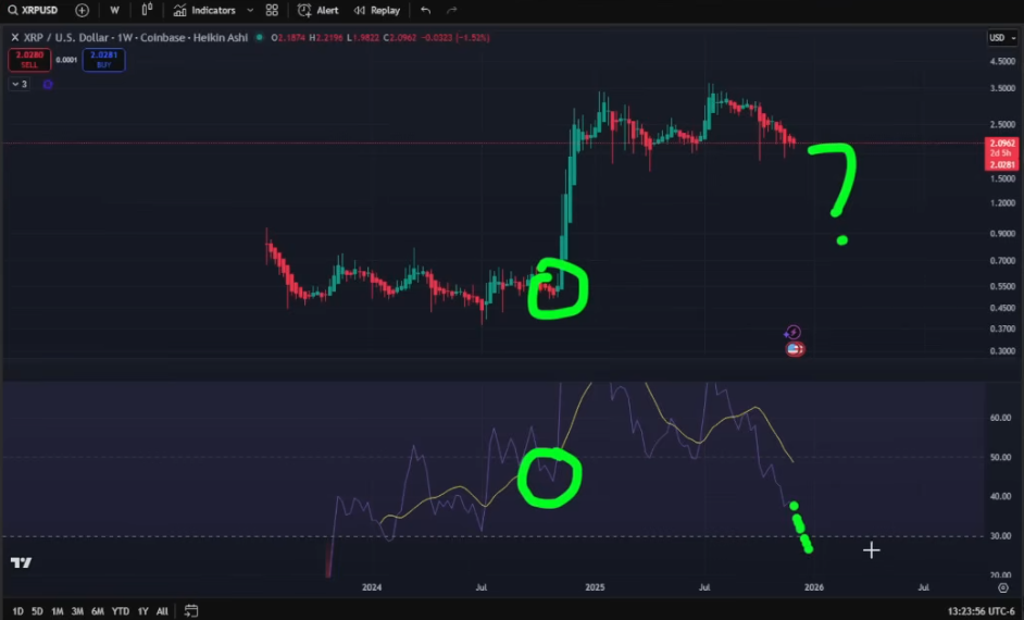 For context, XRP’s first bottom on the weekly chart was $0.5 in November 2024. Meanwhile, the second bottom could rest around the region of the projected flash crash, forming a higher low. However, within this period, the RSI has formed an initial bottom of 44 in November 2024, while the next bottom could be below the 30 mark, marking a lower low.