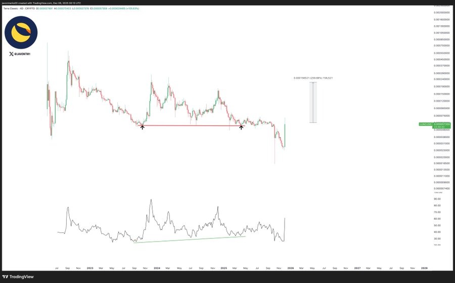 Top crypto analyst JAVON MARKS says this move reset a key bullish divergence, which is often seen before big upward moves. He believes LUNC could still have room to grow, with a possible 270% upside toward $0.00021 if momentum continues.