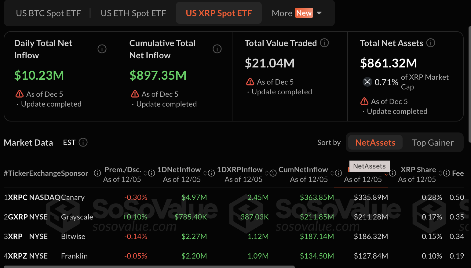 As of the close of business last week, XRP ETFs have attracted $897 million in inflows over 15 consecutive trading days. Major contributions came from Canary Capital with $363.89 million and Grayscale’s GXRP with $211.85 million. Others, including Bitwise and Franklin, have also purchased XRP worth $187.14 million and $134.5 million, respectively.