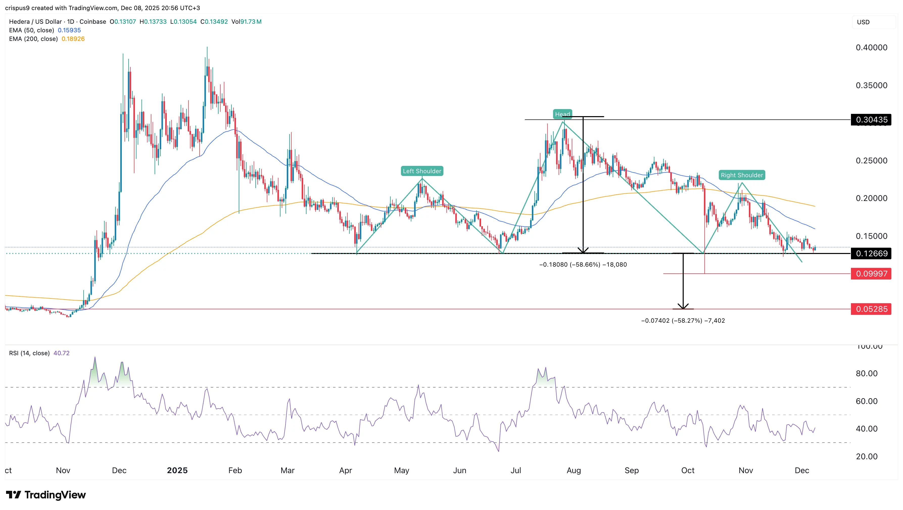 HBAR price is now sitting near the neckline at $0.1266, its lowest level in April, June, and November this year. The distance between the head and the neckline is ~58%, and measuring the same distance from the neckline points to a drop to $0.052.
