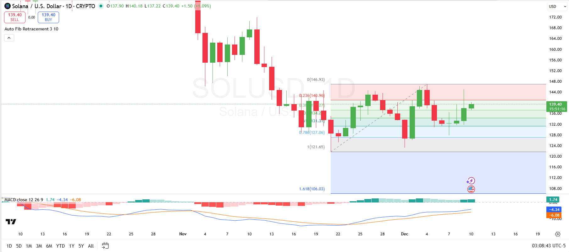 A breakout above $140.96 could signal a potential move toward the next resistance at $146.9, which is above the 0 Fibonacci level. However, if the price fails to break above these levels, a reversal could push the price toward lower support levels.