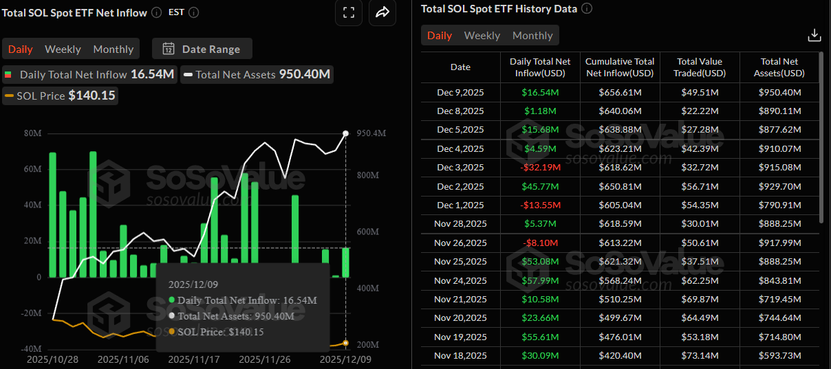 Looking elsewhere, Solana’s Spot ETFs have been experiencing notable positive fluctuations in daily net inflows, suggesting a recovering market sentiment. On December 9, 2025, the ETFs saw an inflow of $16.54 million, pushing their cumulative net inflow to $656.61 million.