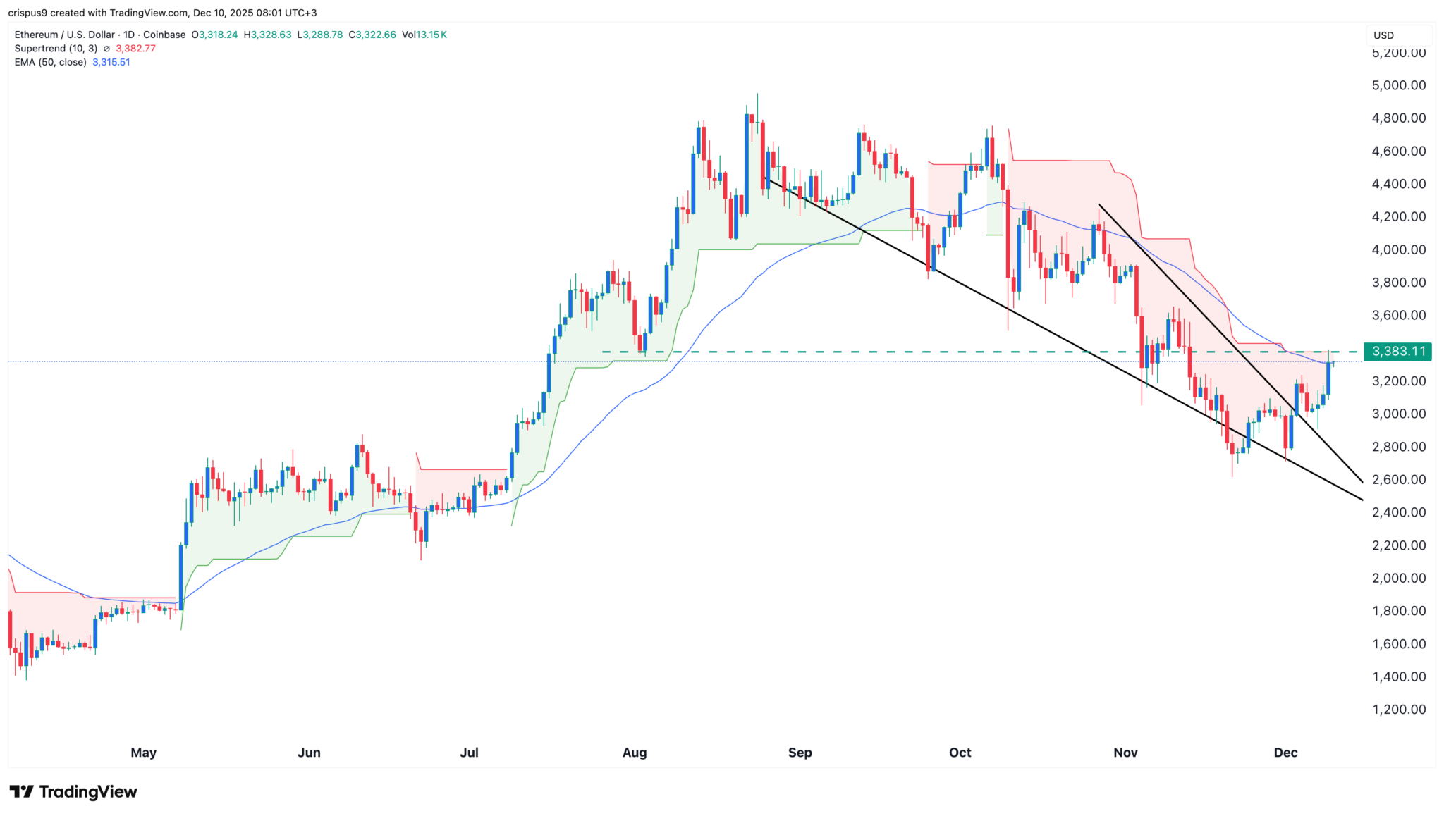Ethereum price has also moved above the upper side of the falling wedge pattern, which is one of the most popular bullish reversal signs in technical analysis. It is also about to move above the 50-day moving average. Therefore, the coin may eventually rebound to the psychological level at $4,000 in the coming weeks or months.