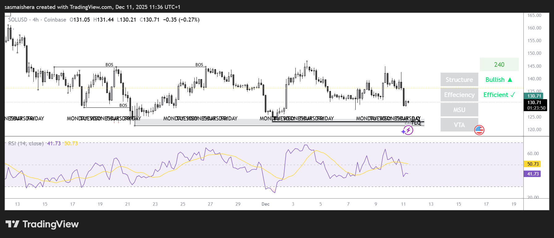 The SOL/USD 4-hour chart remains bullish and efficient despite Solana losing 4.5% of its value in the last 24 hours.