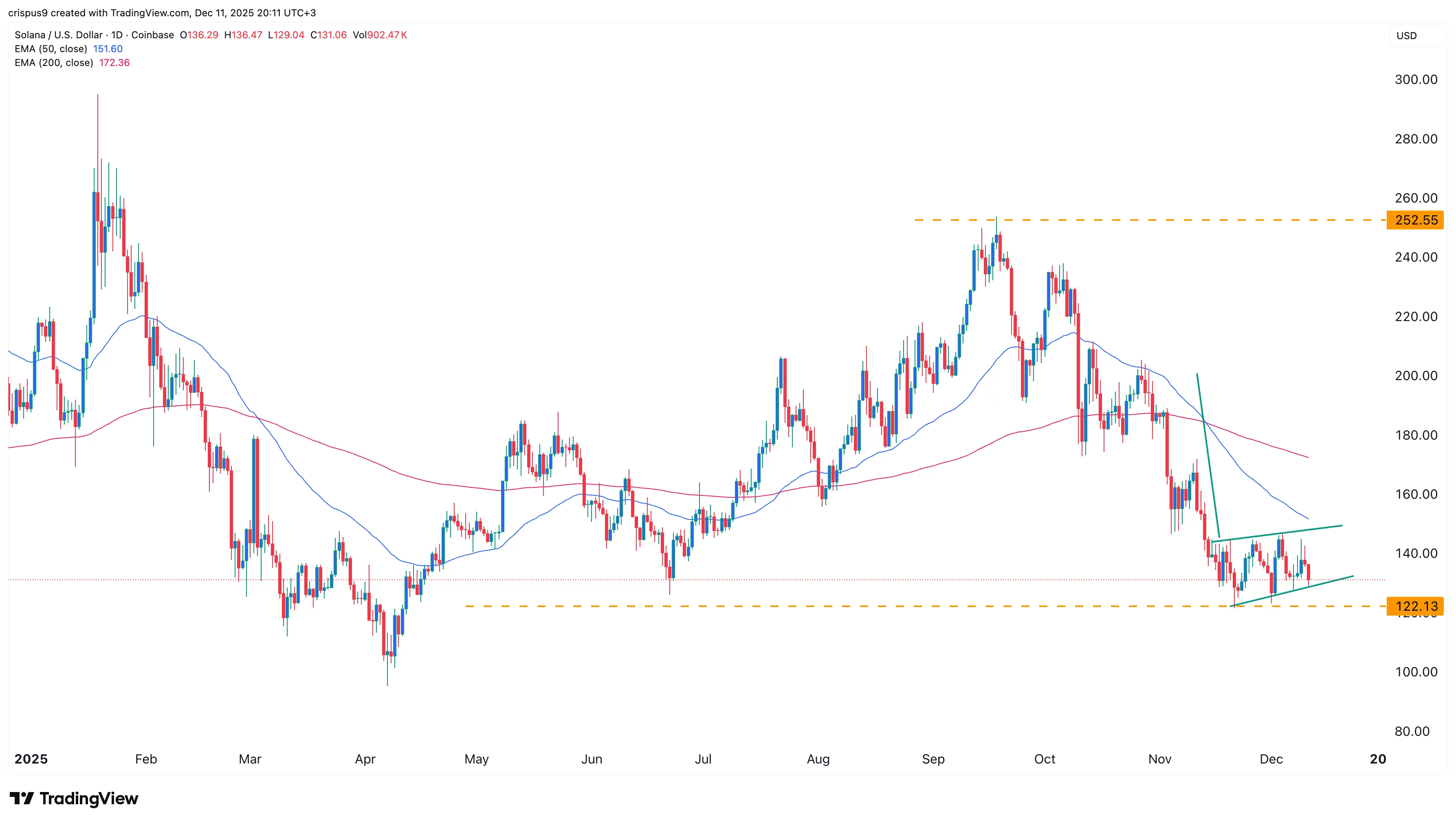 The Solana (SOL) token was trading at $131 today, Dec. 11, down by nearly 50% from its highest level in September this year, and technical indicators suggest further downside, potentially to $100.