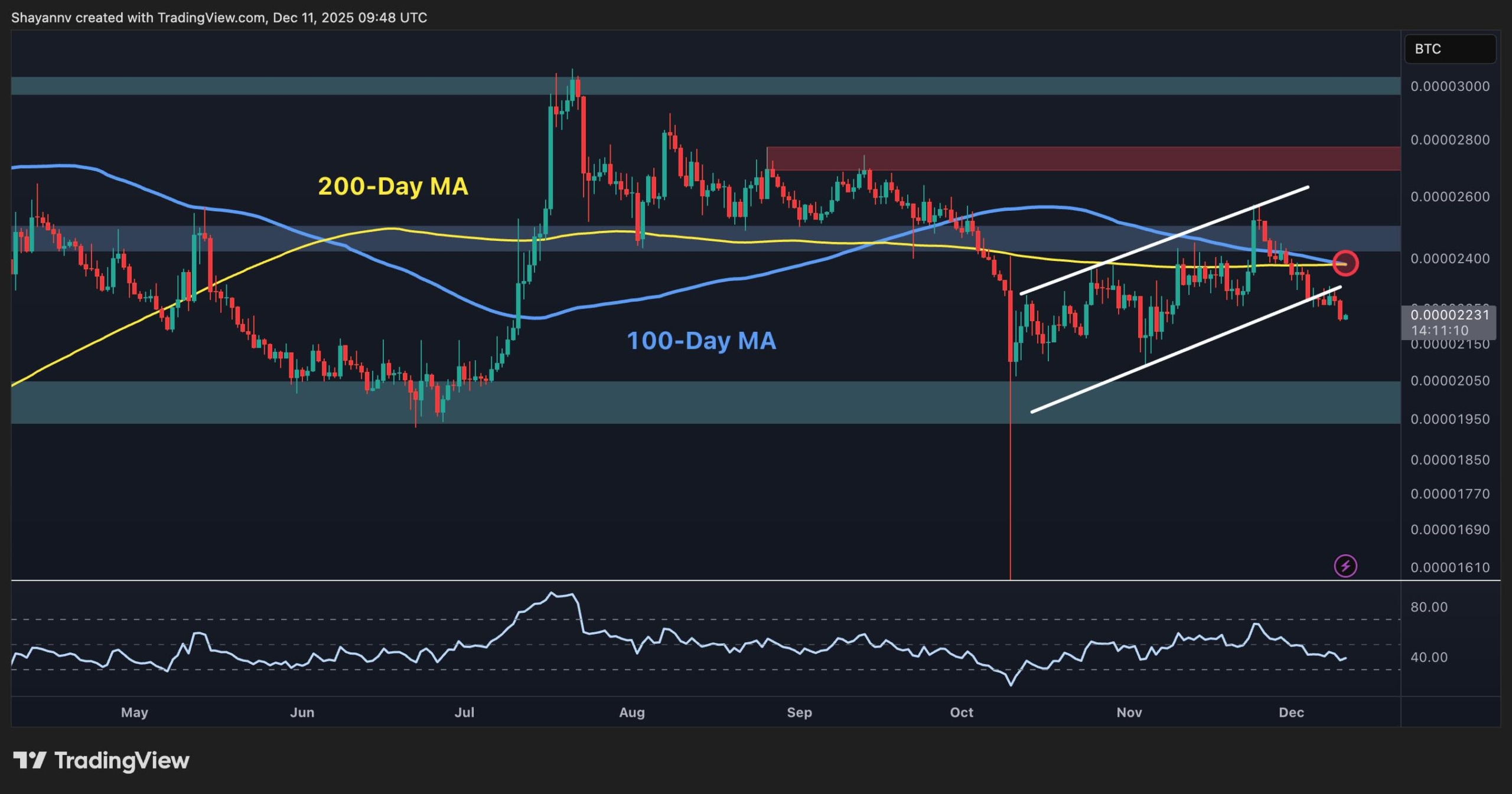 Against Bitcoin, XRP has also broken down from its ascending channel pattern. The break beneath 2,400 sats was a key technical failure, and the pair now sits around 2,230 sats. Both the 100-day and 200-day MAs have flipped into resistance at around the 2,400 sats mark and capped upside attempts in the past week.