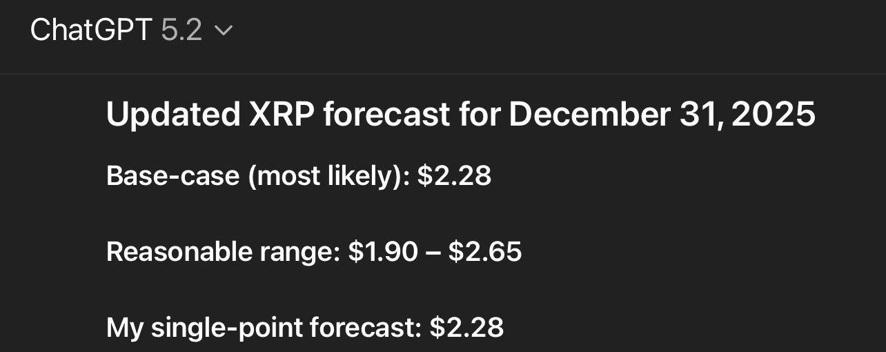 To gauge XRP’s realistic price trajectory, Finbold prompted ChatGPT 5.2, OpenAI’s most advanced large language model, to assess where XRP could stand by December 31, 2025, factoring in current price action, ETF inflows, institutional adoption via Ripple Payments, and mounting technical headwinds such as declining volume and whale driven selling pressure.