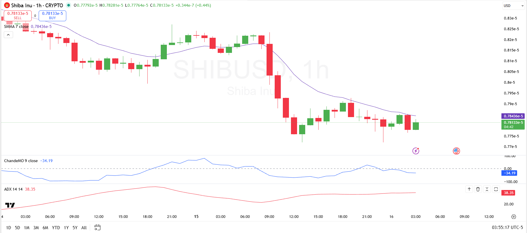 Looking deeper into the hourly chart, SHIB remains below the 7-period smoothed moving average (SMMA), which sits near $0.00000784. The moving average is sloping downward and has been acting like dynamic resistance. Rebounds are still being capped until the price can close back above that level and hold.