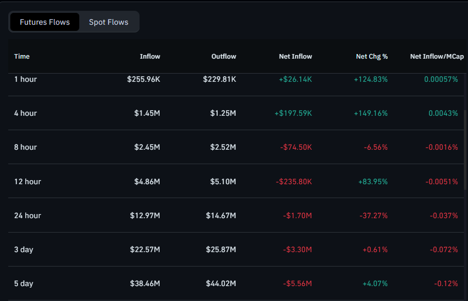 Elsewhere, SHIB’s futures flows are sending a clear signal that traders remain cautious, with net outflows persisting across the latest time windows. Over the 12-hour timeframe, SHIB futures flows show $4.86M in inflows versus $5.10M in outflows, leaving a net outflow of about $235.8K.