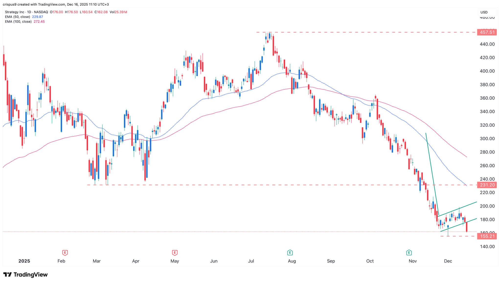 The MSTR stock price continued its downward trend as Bitcoin and other coins plunged on Monday. Strategy dropped by 8.15% on Monday, reaching a low of $162, which was slightly above the year-to-date low of $155.
