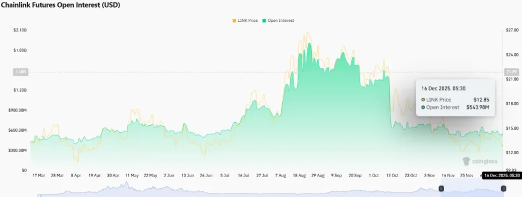 Chainlink’s market behavior reflects a lull in the price’s movement in either direction. Trading patterns have been in a balancing range without any significant changes to the upside or down. In the derivatives segment, the total outstanding positions with respect to LINK futures have seen a moderate decline. Data from Coinglass shows this figure has fallen to $545 million, with a gradual decline in the past periods.