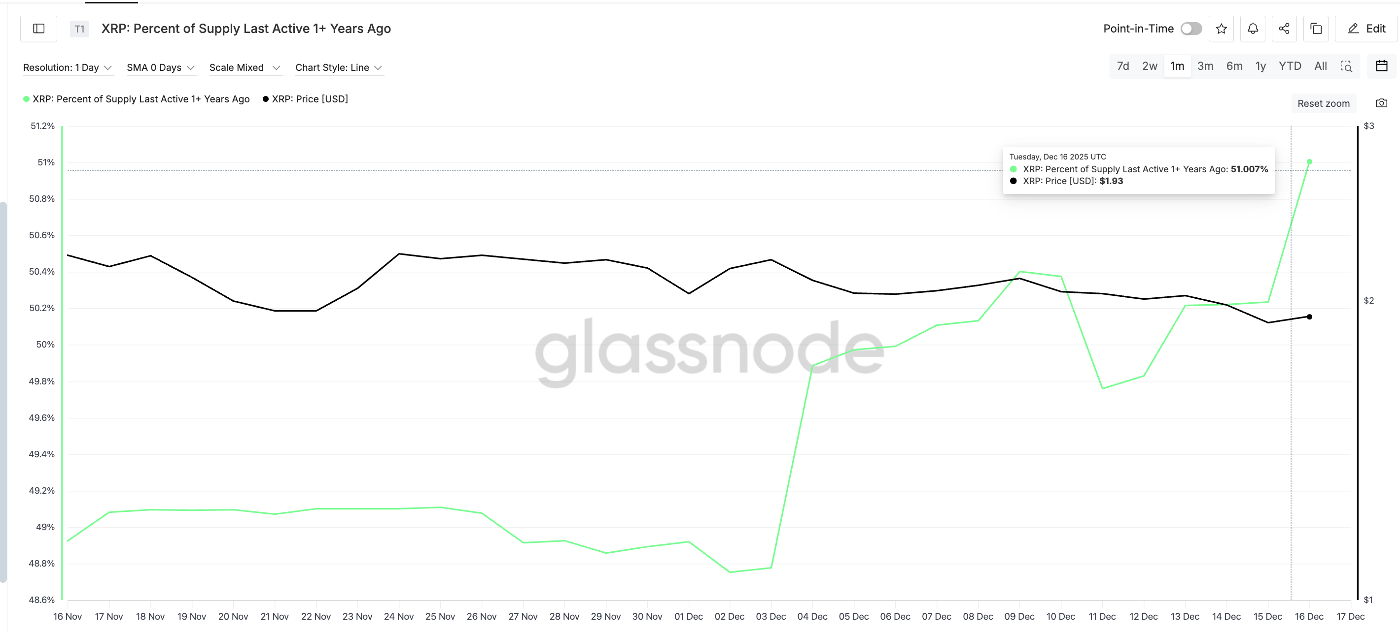 One concerning signal comes from the percent of XRP supply last active more than one year ago. That metric has jumped from 48.75% on December 2 to 51.00%, its highest level in about a month. When older coins start moving, it often means long-held supply is becoming active, which can add sell pressure even without panic.