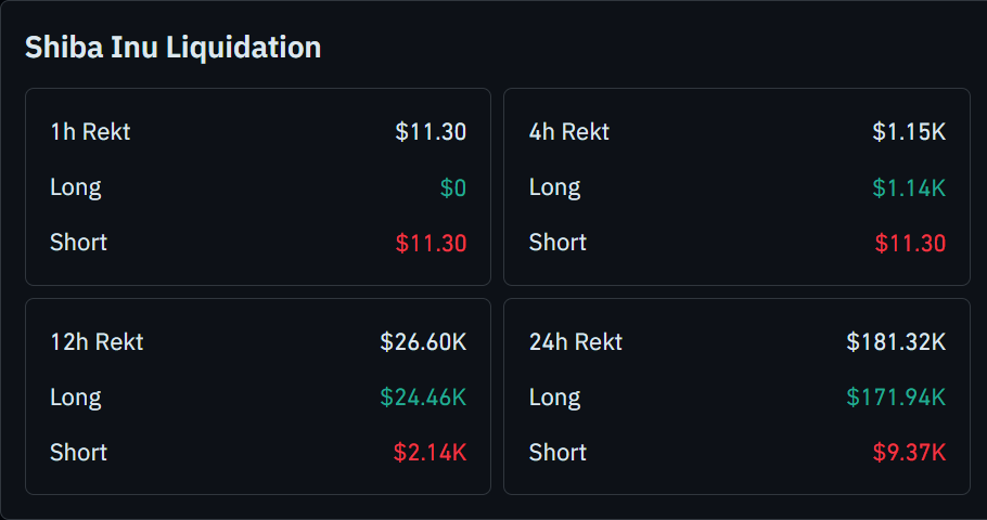 Meanwhile, the liquidation data for Shiba Inu reveals significant volatility in the market, with various time frames showing varying levels of liquidation. Over the past 24 hours, Shiba Inu has seen a total liquidation of $181.32K.