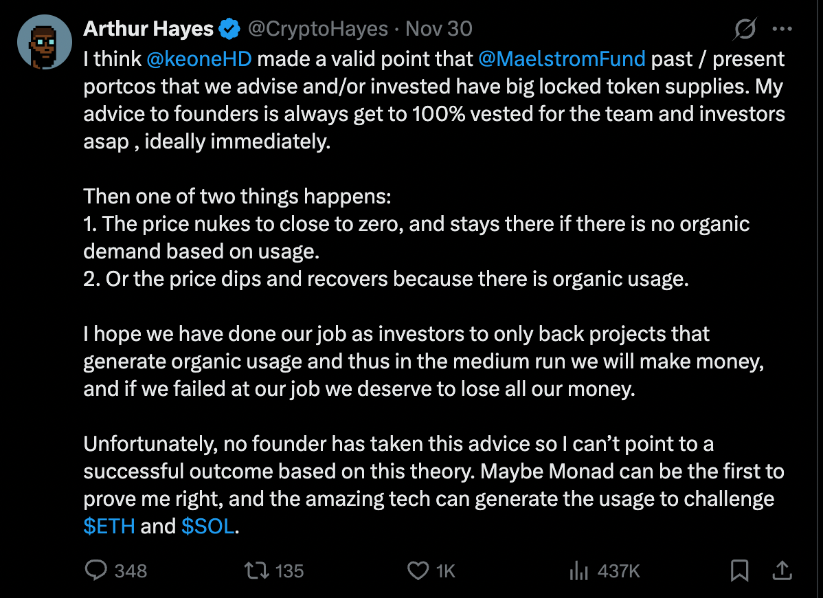 Recently, Arthur Hayes of Maelstrom Capital went on a rant about lock-ups, specifically related to Monad. As a trader, Hayes clearly doesn’t like the illiquidity of these types of tokens.
