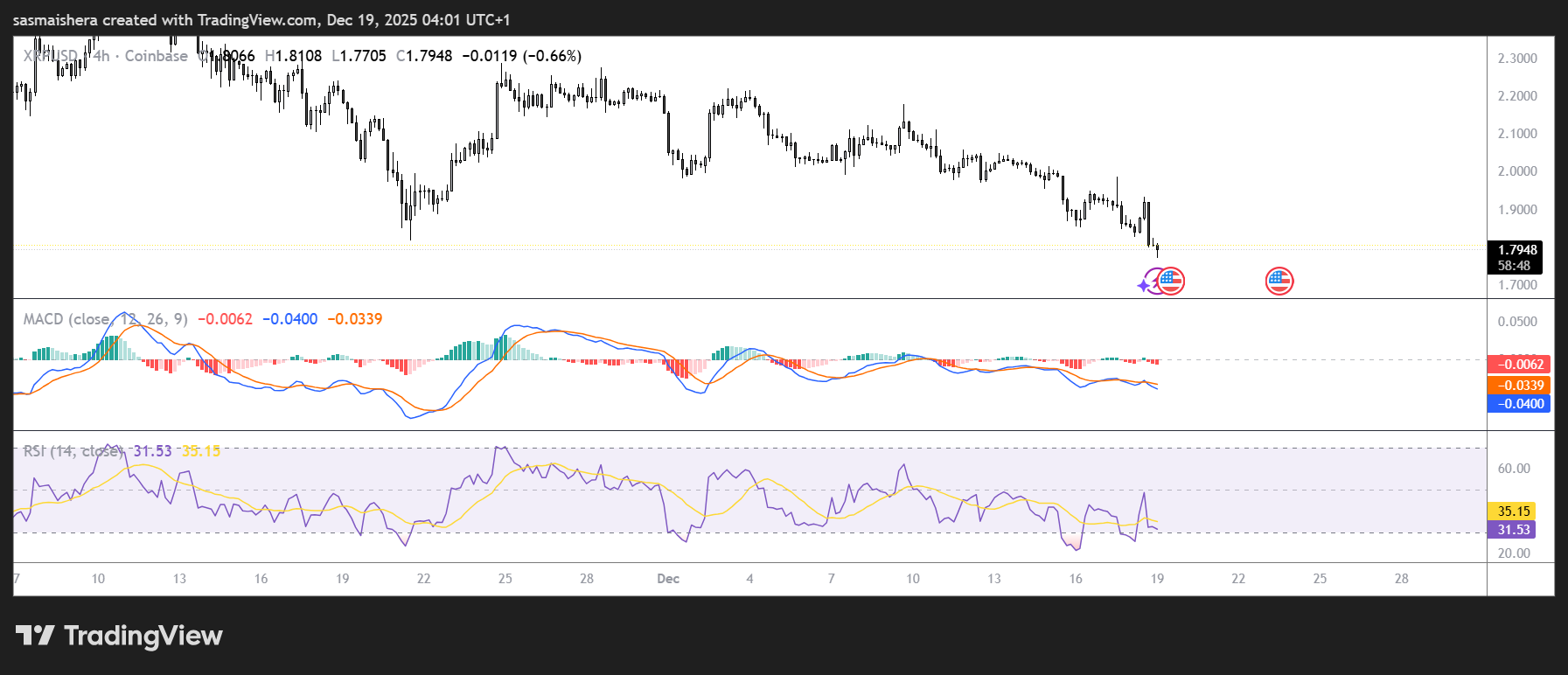 The XRP/USD 4-hour chart is bearish thanks to the coin losing 4% of its value in the last 24 hours.