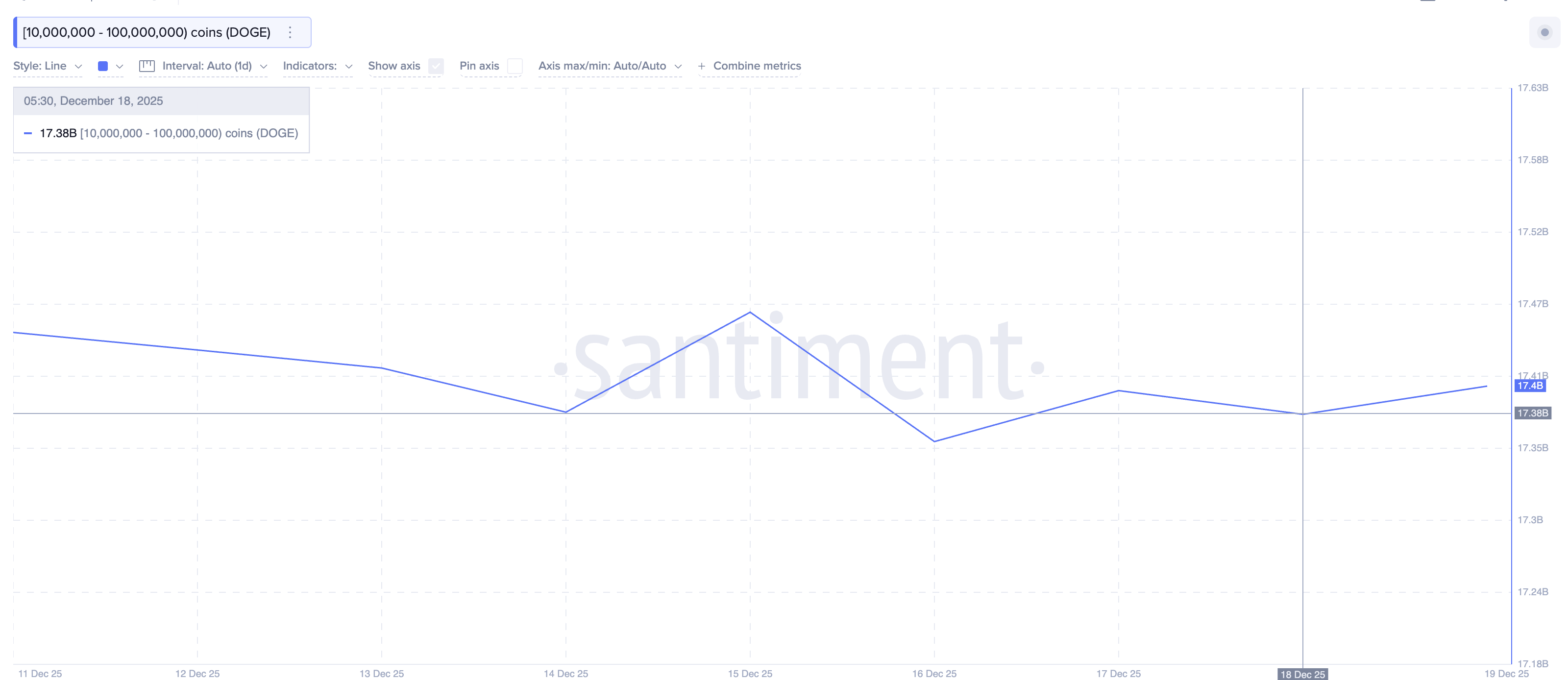 Dogecoin is the largest name on this list per market cap data. Over the past 24 hours, mid-sized Dogecoin whales holding between 10 million and 100 million DOGE increased their combined balance from 17.38 billion to 17.40 billion DOGE. That is an addition of roughly 20 million DOGE.