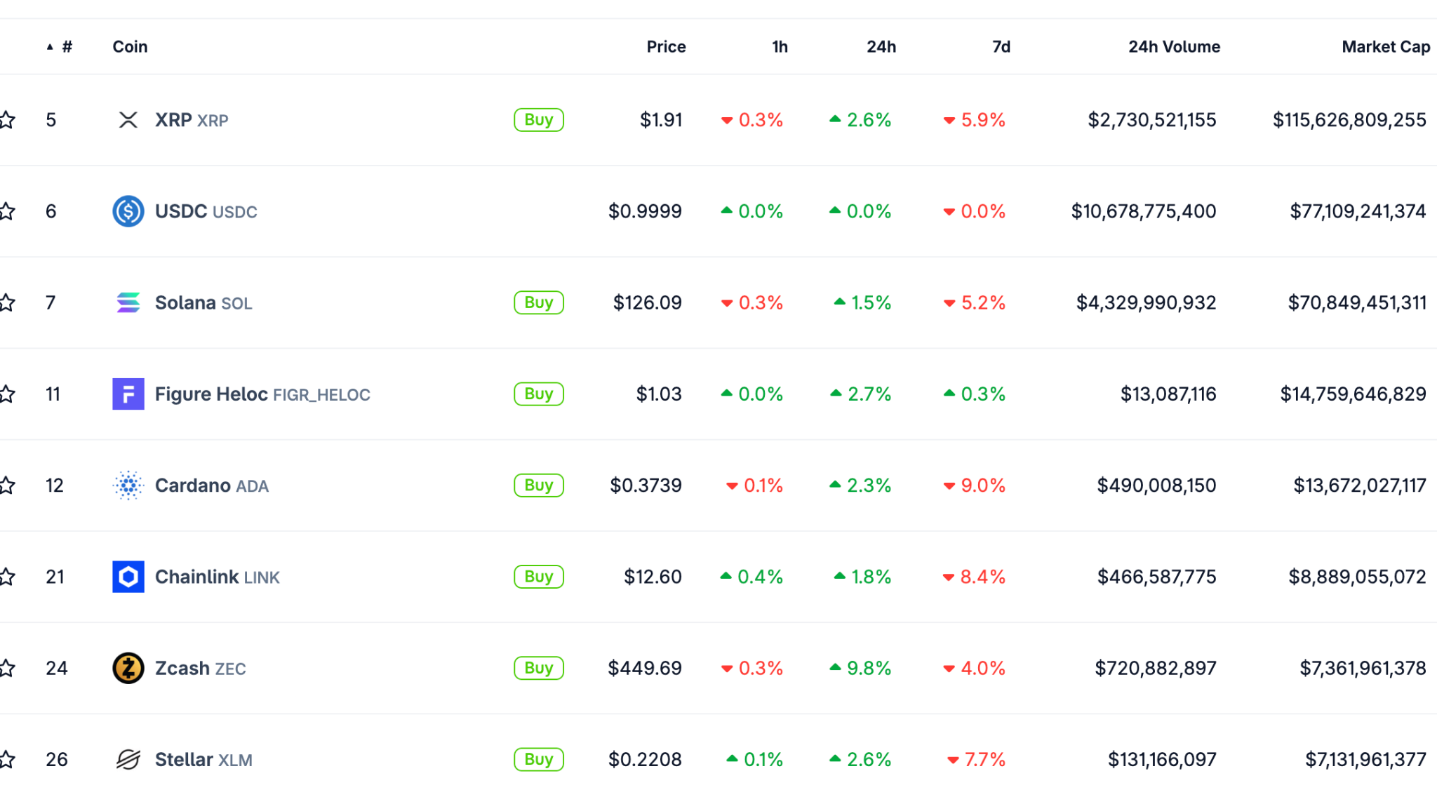 Meanwhile, Cardano’s (ADA) market cap sits near $13.67 billion, Chainlink’s (LINK) around $8.89 billion, Stellar’s (XLM) at approximately $7.13 billion, and Zcash’s (ZEC) close to $7.36 billion.