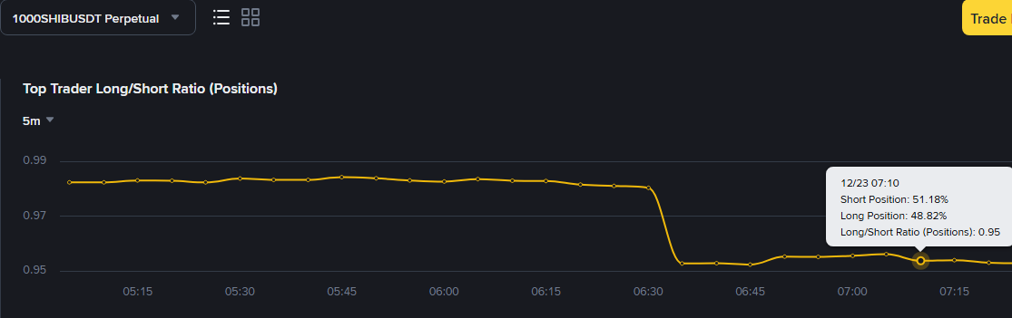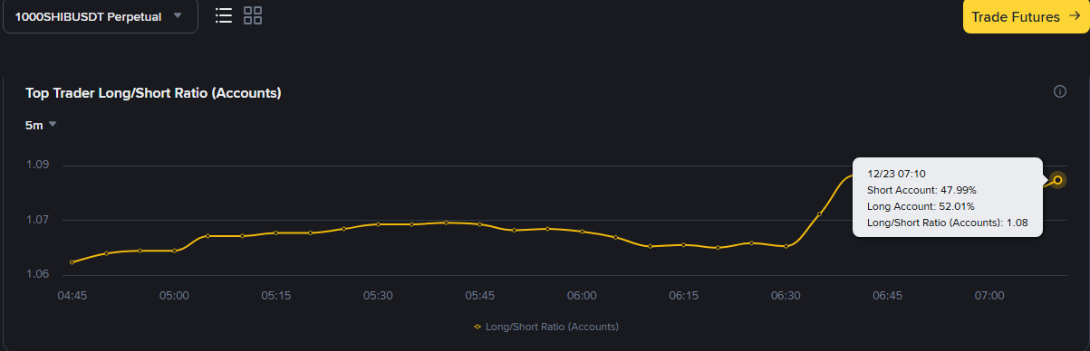 According to the latest figures, Shiba Inu top-trader accounts on Binance hold 52.01% net long versus 47.99% net short. This estimate pushed the long-to-short ratio to 1.08.