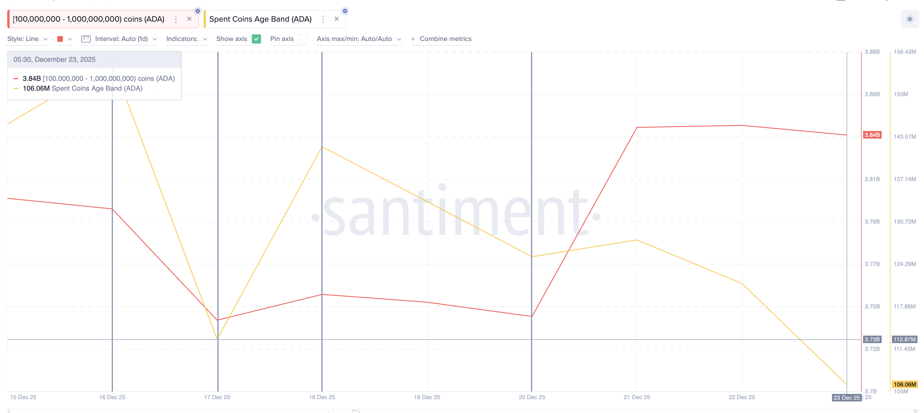 Wallets holding 100 million to 1 billion ADA, Cardano’s second-largest whale cohort, have increased their holdings since December 20. Their balances rose from 3.74 billion ADA to 3.84 billion ADA, an addition of roughly 100 million ADA. At current prices, that equals about $36 million added during a period of weak price action.