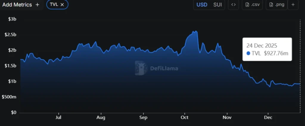 The onchain data shows a similar trend. According to DeFiLlama data, the SUI’s total volume locked has been wavering sideways around $900 million since late November. Liquidity providers and participants in lending, DEXs and other applications seem to be happy with existing commitments without major new inflows or outflows of capital.