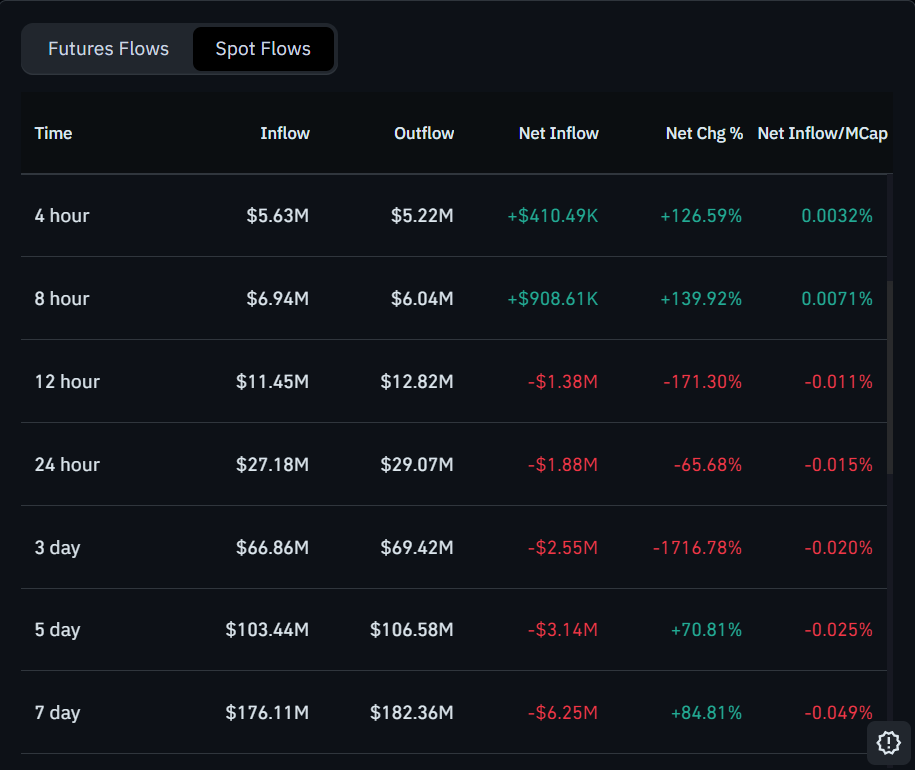 The 8-hour spot flows also reflect a favorable net inflow of $908.61K, marking a 139.92% increase, indicating short-term buying interest. However, the 12-hour and 24-hour spot flows show a decline, with net outflows of $1.38M and $1.88M, respectively, pointing to some bearish sentiment in the market.
