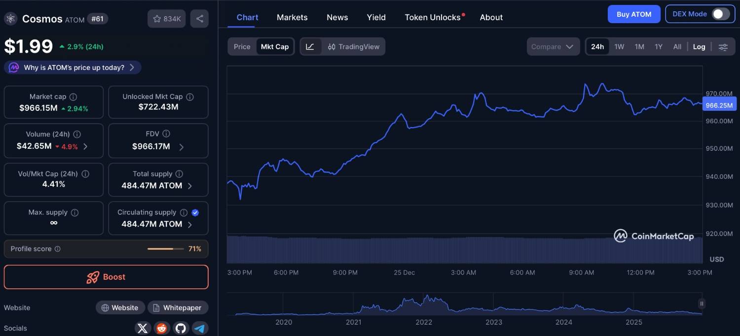 Cosmos (ATOM) is approaching the $1 billion market cap mark from a fundamentally different angle. ATOM rose just over 3% in the past 24 hours, outperforming the broader crypto market, and currently sits near a $966 million valuation. While still down nearly 19% over the past 30 days, recent developments suggest improving medium-term fundamentals.