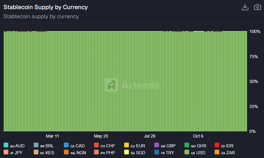 As a result, euro-pegged stablecoins remain a niche. Artemis data shows their supply barely changed over the year, holding at roughly 0.18% of the total market, with dollar-pegged stablecoins dominating the lion’s share.