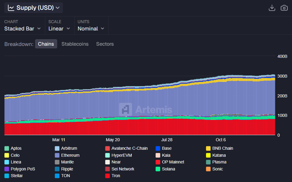From an on-chain perspective, Ethereum still holds the largest share of circulating supply at over $170 billion, followed by TRON with $81 billion, and Solana with $16.3 billion, according to data from Artemis.