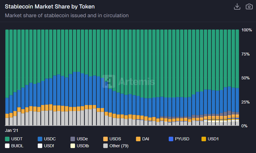 By supply, Tether’s USDT remains the dominant force, controlling over 60% of the market. In late January, Circle’s USDC briefly neared 37% market share but later declined, staying below 26% for the remainder of the year.