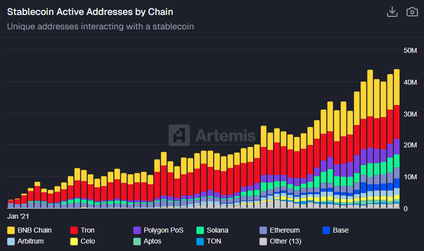 But when measured by network usage, the picture changes significantly. BNB Chain leads with more than 11 million unique addresses interacting with stablecoins as of November, followed by TRON and Polygon, with 10.6 million and 4.8 million, respectively.