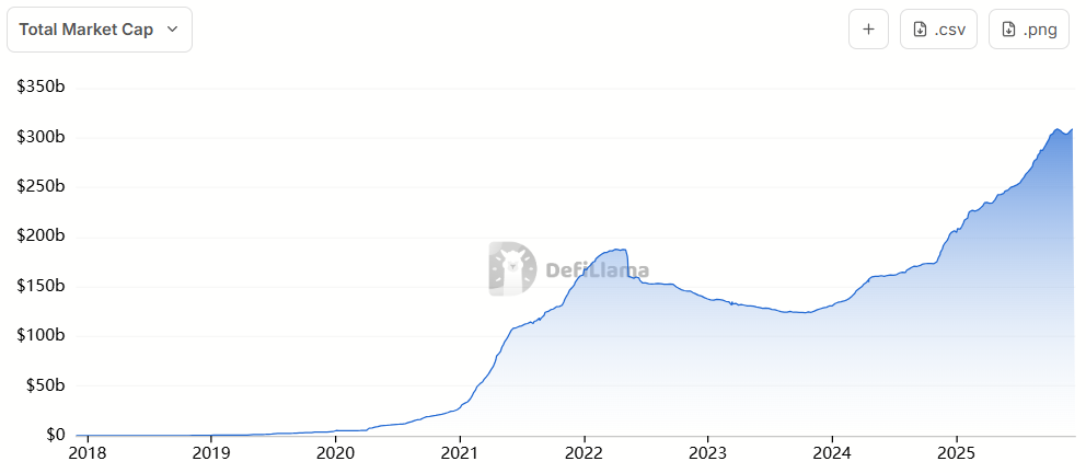 Stablecoins finished 2025 far bigger and louder than most expected. On-chain data from DefiLlama shows that the total stablecoin supply is near $310 billion as of mid-December, up more than 50% from the roughly $205 billion at the start of the year.