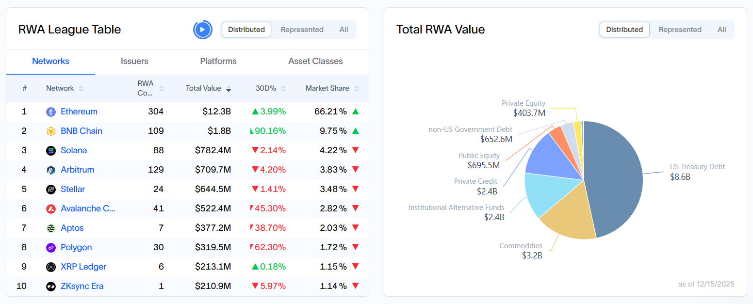 But at the on-chain level, Ethereum remains the dominant blockchain for RWAs, hosting around $12.3 billion in distributed tokenized assets, per RWA.xyz. It’s followed by BNB Chain and Solana, with $1.8 billion and $782.4 million, respectively.