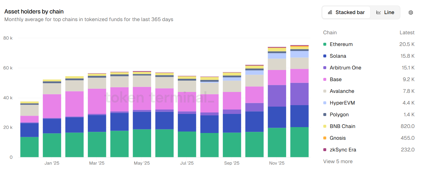 Data from Token Terminal also shows that Ethereum leads in unique addresses holding a non-zero balance in tokenized fund assets, with over 20,000 addresses, followed by Solana at 15,800 and Arbitrum One at 15,100.