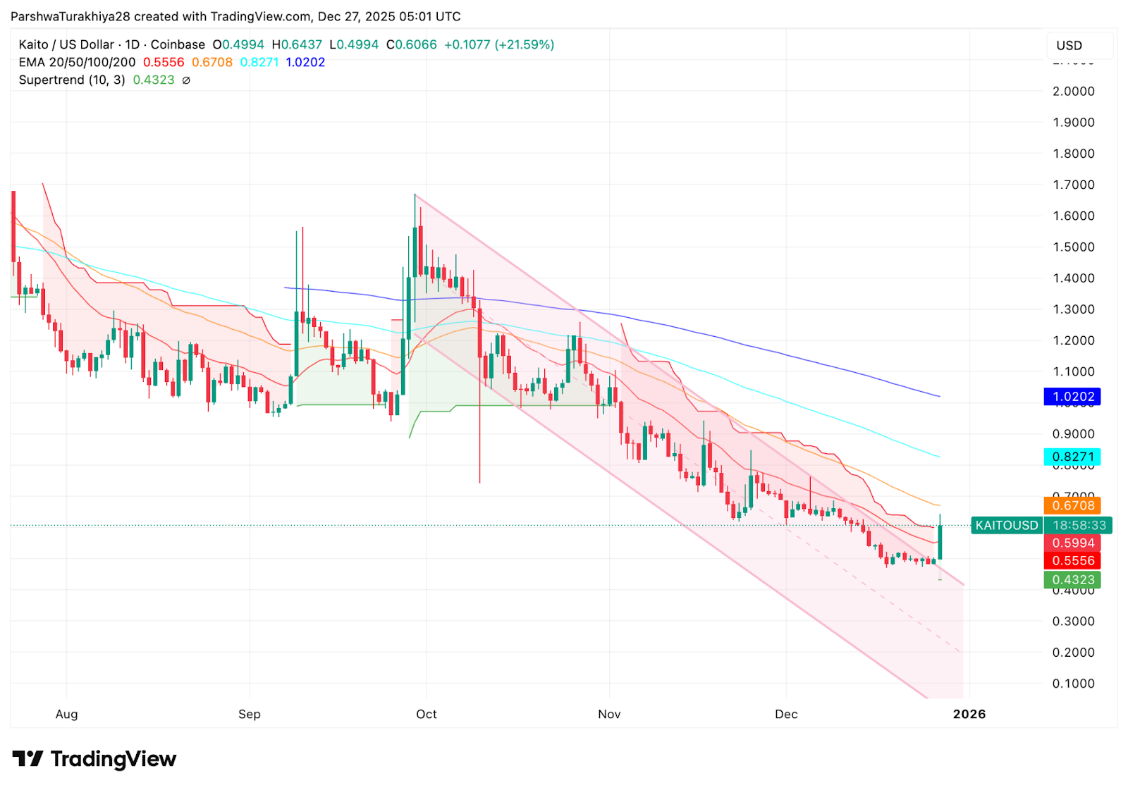 The daily chart shows KAITO breaking higher from the lower boundary of a descending channel that has guided price lower since October. The bounce originated near the $0.49 to $0.50 base, a zone that has repeatedly attracted dip buyers over the past month.