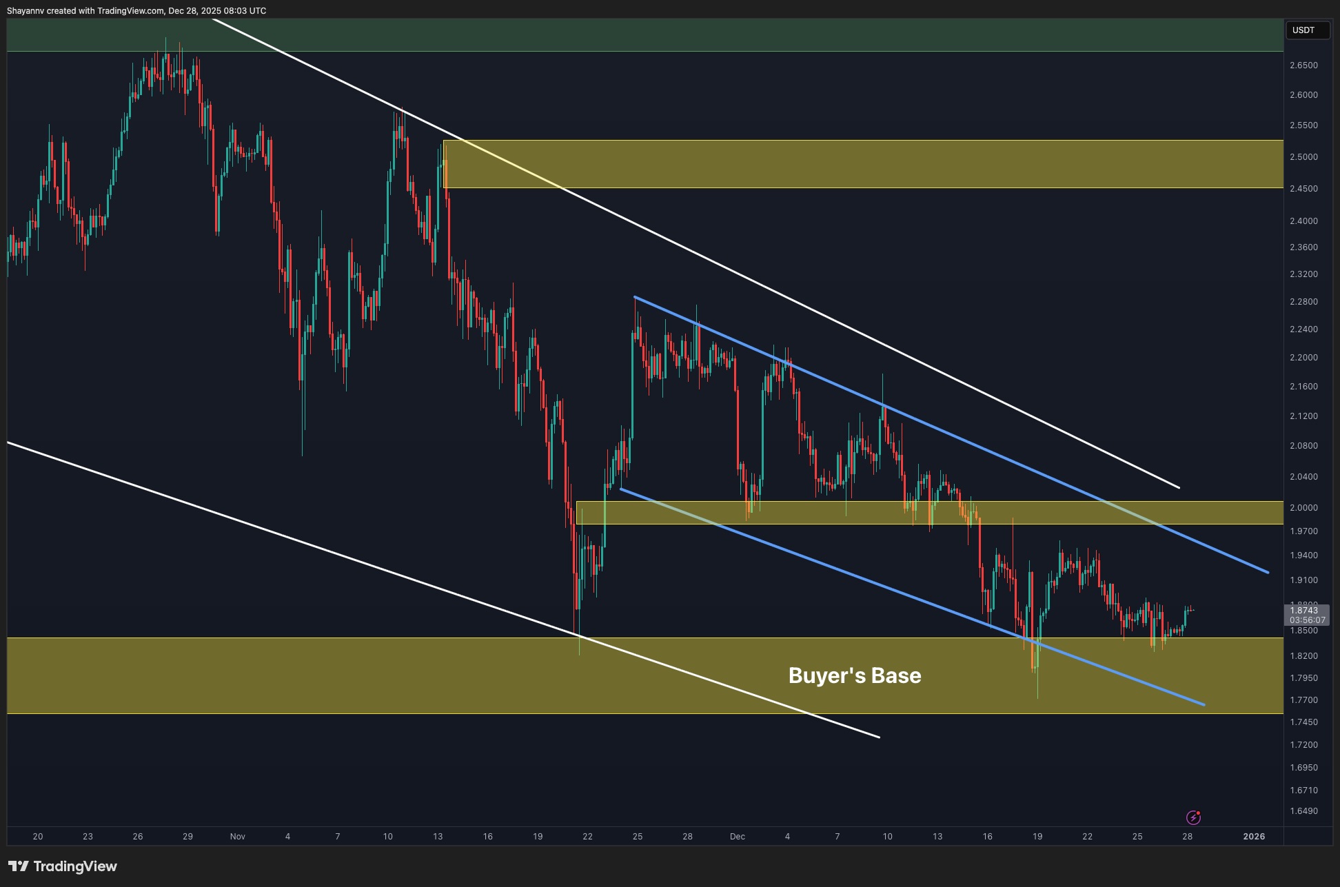The repeated failure to reclaim the former support-turned-resistance zone around $2.40 to $2.50 reinforces the bearish bias on the higher timeframe. Until XRP can decisively break above the descending structure and reclaim these dynamic resistance levels, any upside moves are likely to be corrective rather than trend-changing. As long as the price remains below the channel midline, the daily outlook favors continued consolidation or a gradual drift toward lower demand zones.