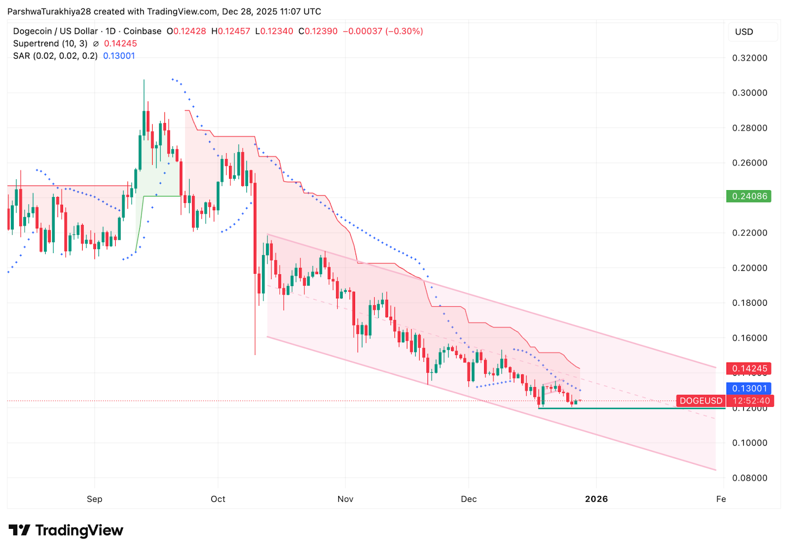 Dogecoin price today trades near $0.124 after another muted session, with price pinned inside a descending channel that has guided losses through December. Sellers continue to control the broader structure as speculative appetite remains weak across meme coins, while ETF flows and thin year end liquidity limit upside follow through.
