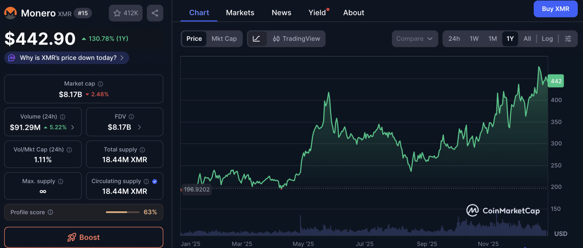 According to CMC, XMR $442.8 24h volatility: 2.8% Market cap: $8.17 B Vol. 24h: $92.41 M gained about 129% year-to-date. It recovered from early-year softness to print new-cycle highs in Q4.