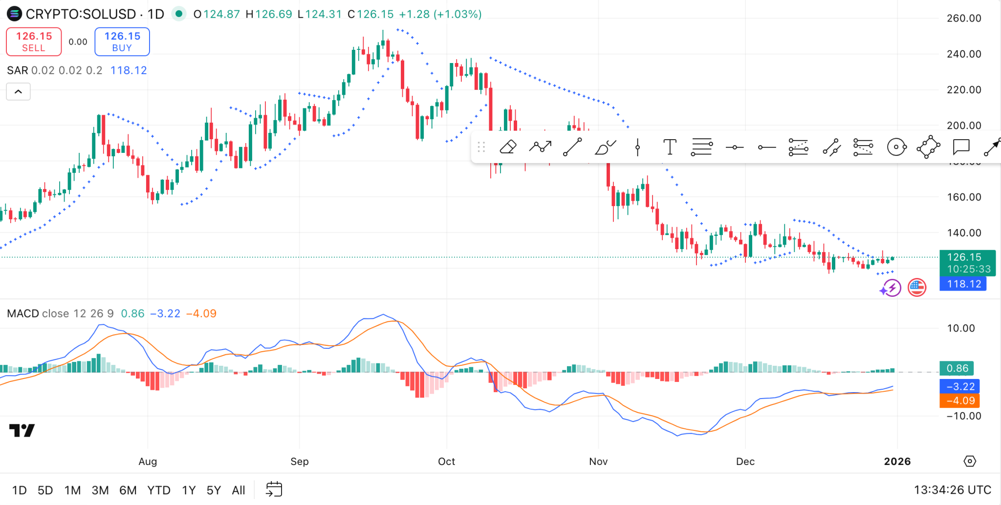 The Solana chart presents a notable price action, with a focus on key indicators like the Parabolic SAR and the MACD. Specifically, the Parabolic SAR is currently placed at $118.12, just below the price. This suggests a bullish trend, as the dots are positioned under the candles, which aligns with the recent upward movement.