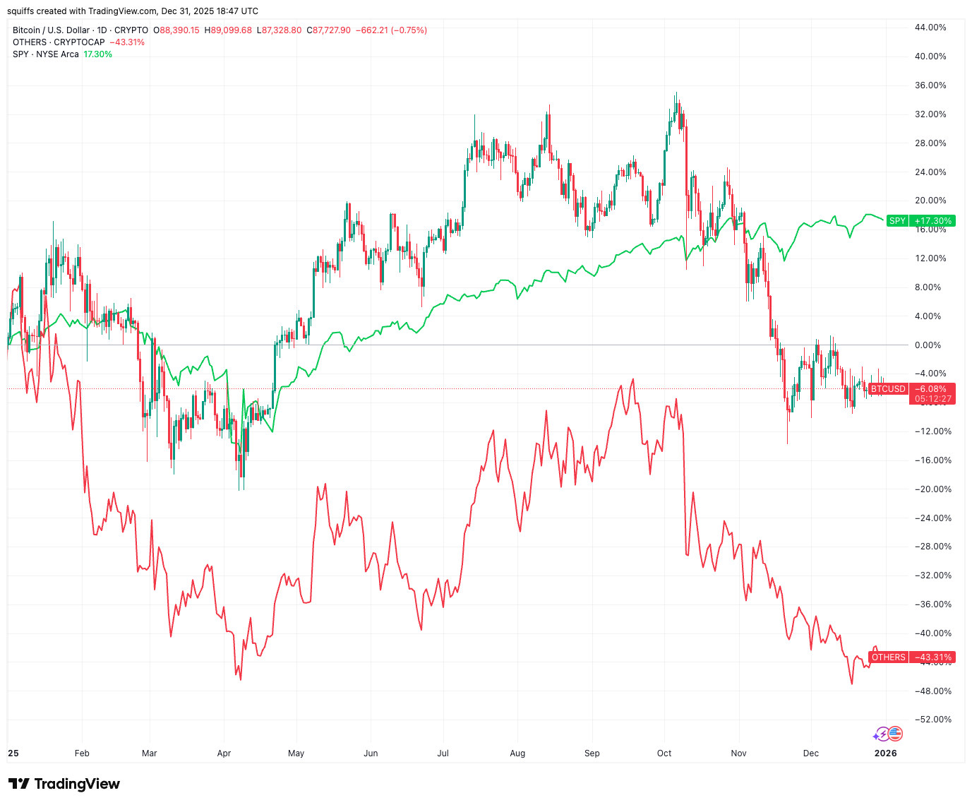 Since the beginning of the year, the S&P 500 is up 17%, while BTC is down 6%, and the TradingView category? “Others,” which represents the altcoin space, is down a brutal 43%.