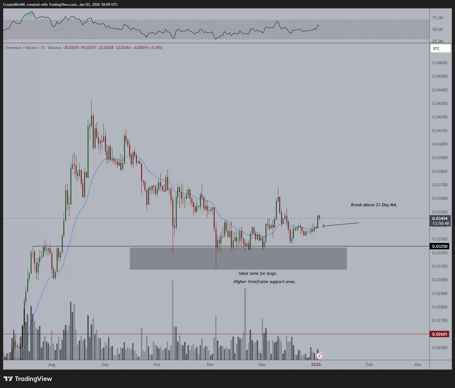 Michaël van de Poppe: In an analysis by renowned analyst van de Poppe, it is predicted that ETH will outperform BTC as long as the ETH price remains above its 21-day moving average on the ETH/BTC chart.