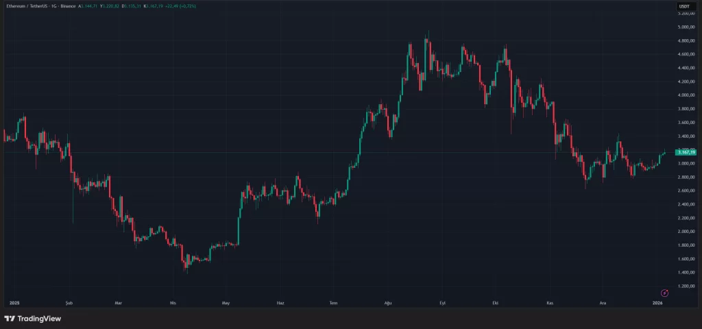 On the altcoin side, the outlook was much more negative compared to BTC. Ethereum (ETH), the largest altcoin, managed to break its all-time high price record in August at $4,953, but quickly retreated from that level and ended the year with a 10% loss. The buying pressure that emerged during the year, led by experienced analyst Tom Lee and Bitmine, which purchased very large amounts of Ethereum, as well as the approved Ethereum spot ETFs, could not prevent the price decline.