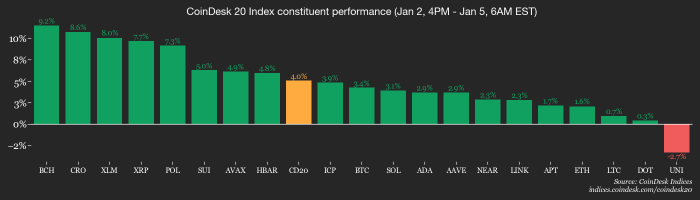 Happy New Year, readers! Crypto's kicking off 2026 with good vibes: Bitcoin BTC$92,917.81 is buoyant near $92,700, up 1.3% in 24 hours and 5% in the first five days of the year.